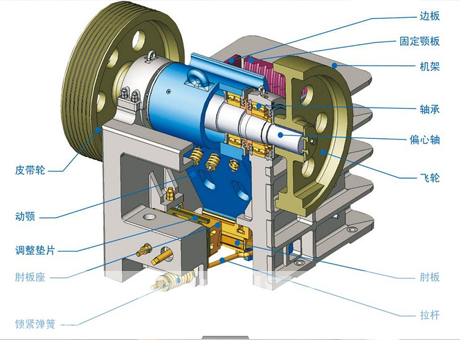 電動機(jī)驅(qū)動皮帶和皮帶輪,通過偏心軸使動顎上下運(yùn)動,當(dāng)動顎上升時肘板與動顎間夾角變大,從而推動動顎板向固定顎板接近,與此同時物料被壓碎或劈碎,達(dá)到破碎的目的;當(dāng)動顎下行時,肘板與動顎間夾角變小,動顎板在拉桿、彈簧的作用下,離開固定顎板,此時已破碎物料從破碎腔下口排出。隨著電動機(jī)連續(xù)轉(zhuǎn)動而破碎機(jī)動顎作周期性地壓碎和排泄物料,實(shí)現(xiàn)批量生產(chǎn)。